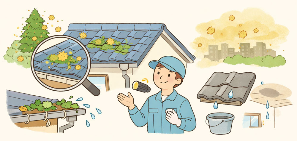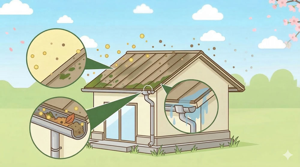 春になると、暖かな陽気とともに花粉や黄砂が多く飛来します。目や鼻への影響が注目されがちですが、実は住まいの屋根や雨樋にとっても、見逃せない季節です。